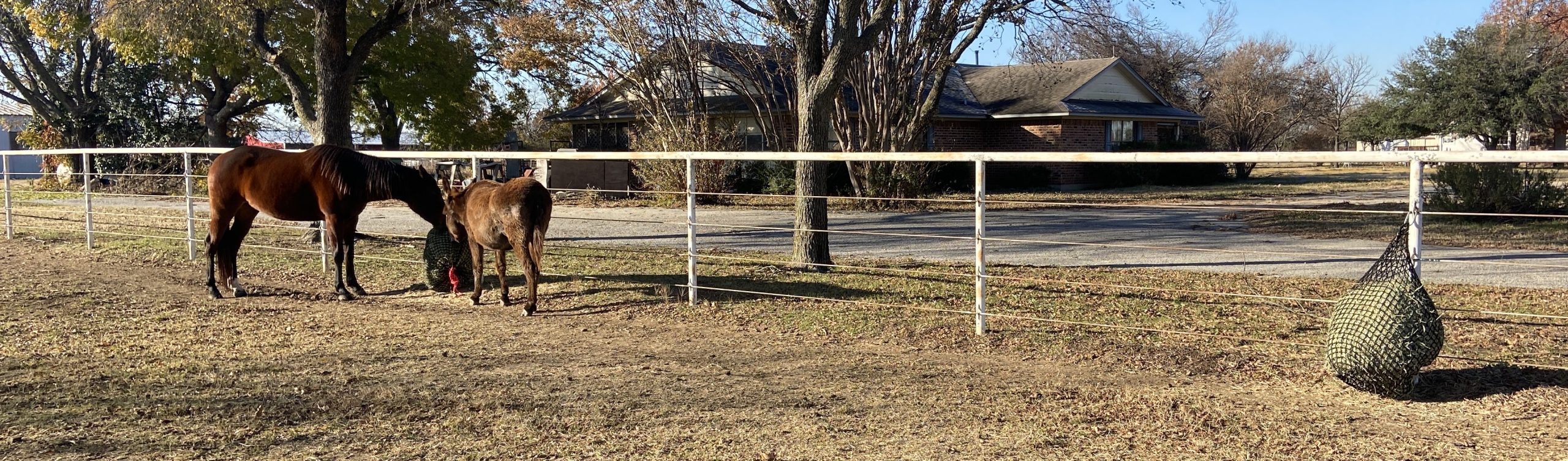 In the photo above, I had just put out their hay for the day. They are both eating the Teff hay, in the hay bag on the left. The hay bag on the right contains costal hay.