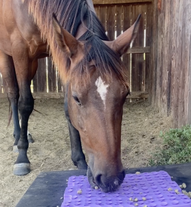 As I thought about Chewie’s first encounter with the snuffle mat, I realized that she primarily eats from buckets, feed tubs, or off the ground.